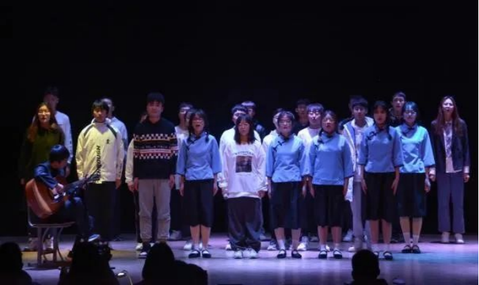 舞台上,同学们在炫彩的灯光下意气风发,展现出当代青年的朝气蓬勃。音乐、舞蹈、朗诵、光影,所有的艺术形式都在生动谱写着中国共产党团结带领中国人民走向伟大复兴的壮丽篇章。