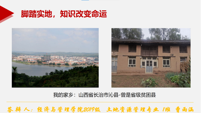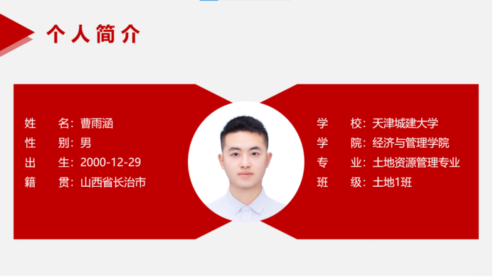 曹雨涵,中共预备党员,2019级土地资源管理1班,现任班级学习委员、2020级土地资源管理专业带班党员、2021级公共管理类学习指导员组长、地三学社社长。